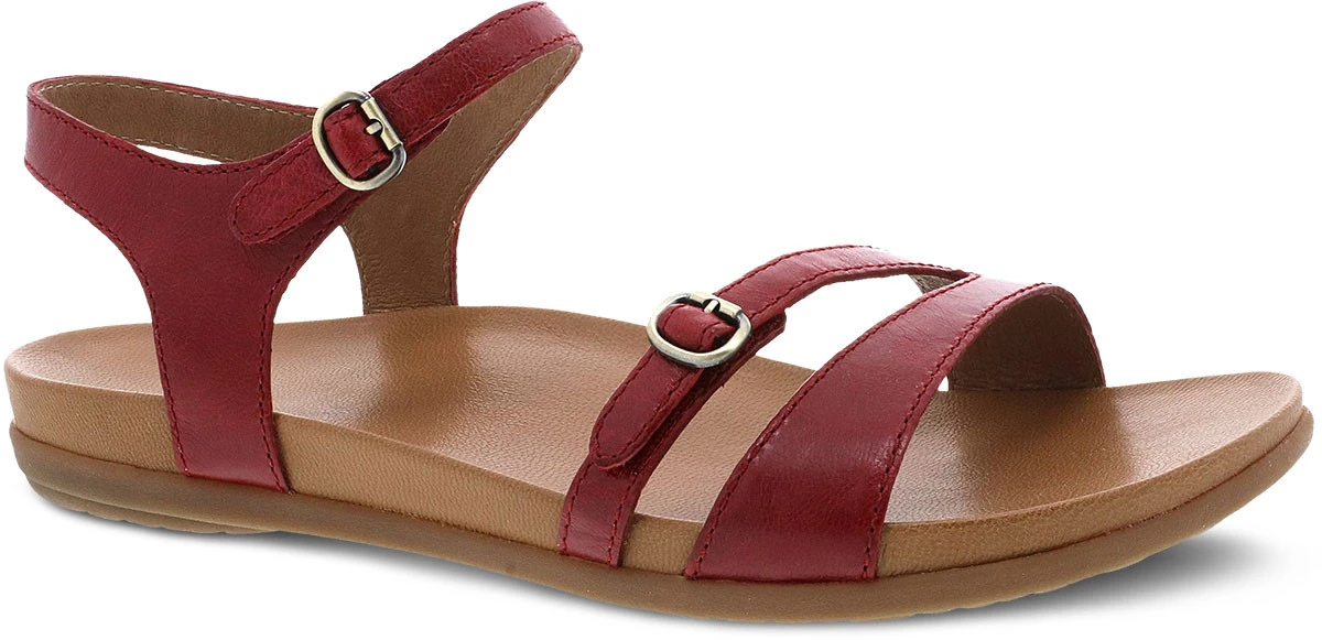 Englin’s Fine Footwear presents the women’s ‘Janelle’ from Dansko. Dress up your sandal wardrobe with Janelle. Dual adjustability with hook and loop closures at the ankle and forefoot result in a perfect fit. This style also features leather uppers, chrome-free leather linings, a full grain leather wrapped contoured EVA footbed, and a lightweight rubber outsole for long-lasting wear.
