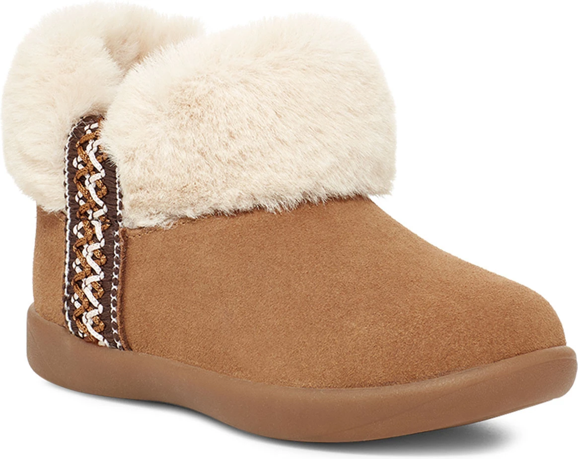 Englin’s Fine Footwear presents the children’s ‘Toddlers Dreamee Bootie’ from UGG. This cute suede bootie features an irregular cuff line and is elevated by the signature UGG braid pattern. A soft cushioned insole and lining crafted from their signature UGGplush upcycled wool blend and a textile lining of 100% recycled polyester with antimicrobial treatment provide support and warmth.