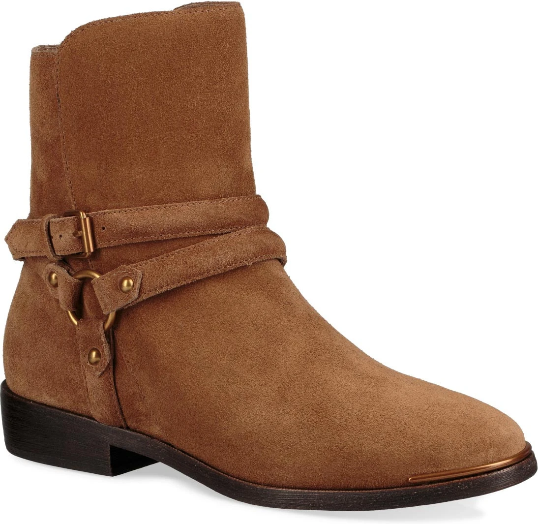 Englin’s Fine Footwear presents the women’s ‘Kelby’ from UGG. A notch above your standard harness boot, this luxe edition boasts rich leather and suede and gleaming gold hardware.